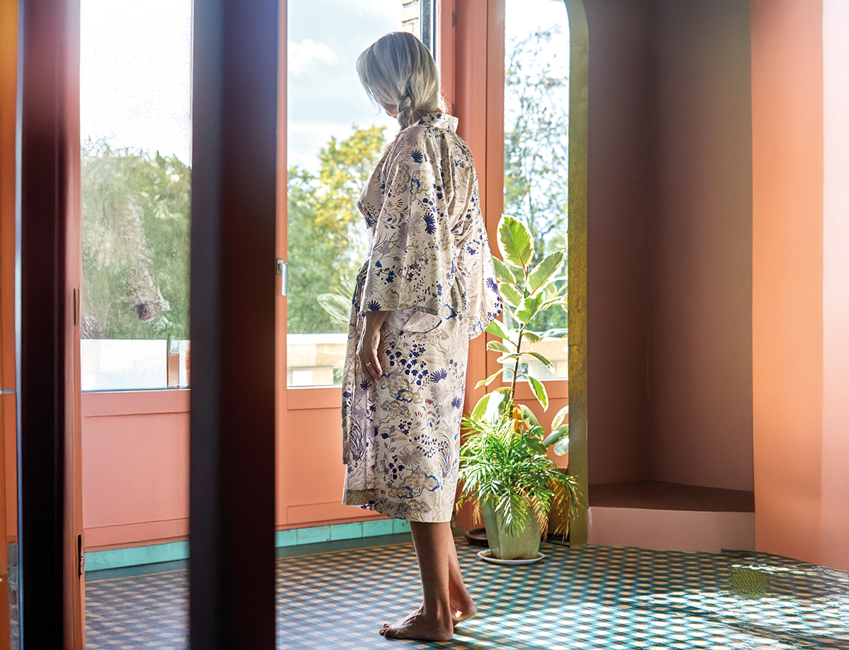 Avec son motif imprimé, ce Kimono évoque l’ambiance feutrée d’un intérieur d’inspiration japonaise, où se rencontrent poésie visuelle, équilibre et apaisement.