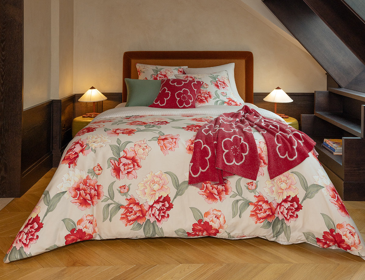 Chaque collection célèbre une décoration expressive et raffinée, inspirée par les voyages, la nature et les cultures du monde. Des parures de lit fleuries ou animalières aux plaids, coussins, serviettes et tapis, Kenzo Home transforme chaque pièce en un espace unique, où design rime avec émotion et personnalité.