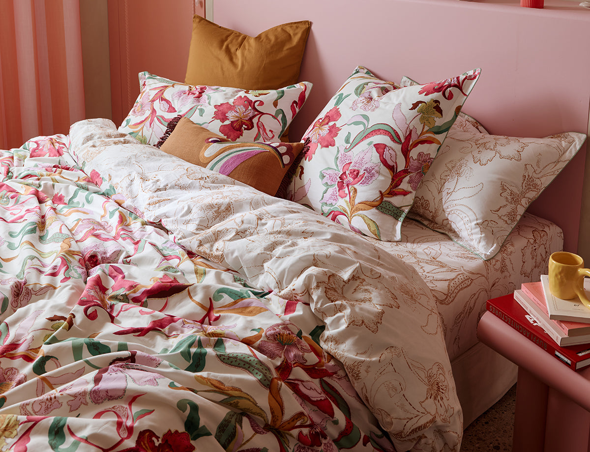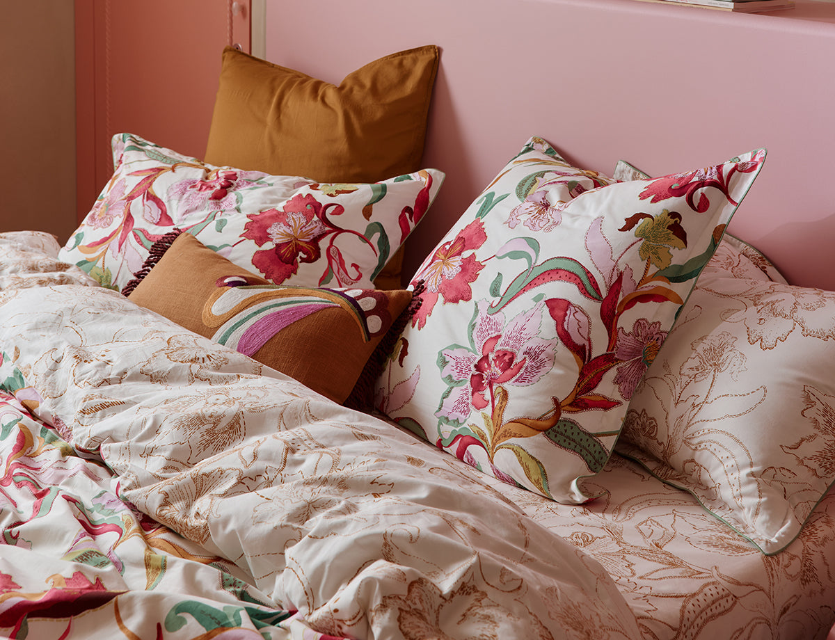 Un design floral inspiré de la Méditerranée, sur une percale blanche lumineuse, des fleurs rose poudré et fuchsia se mêlent à des nuances d’ocre, de parme clair et de feuillages verts.