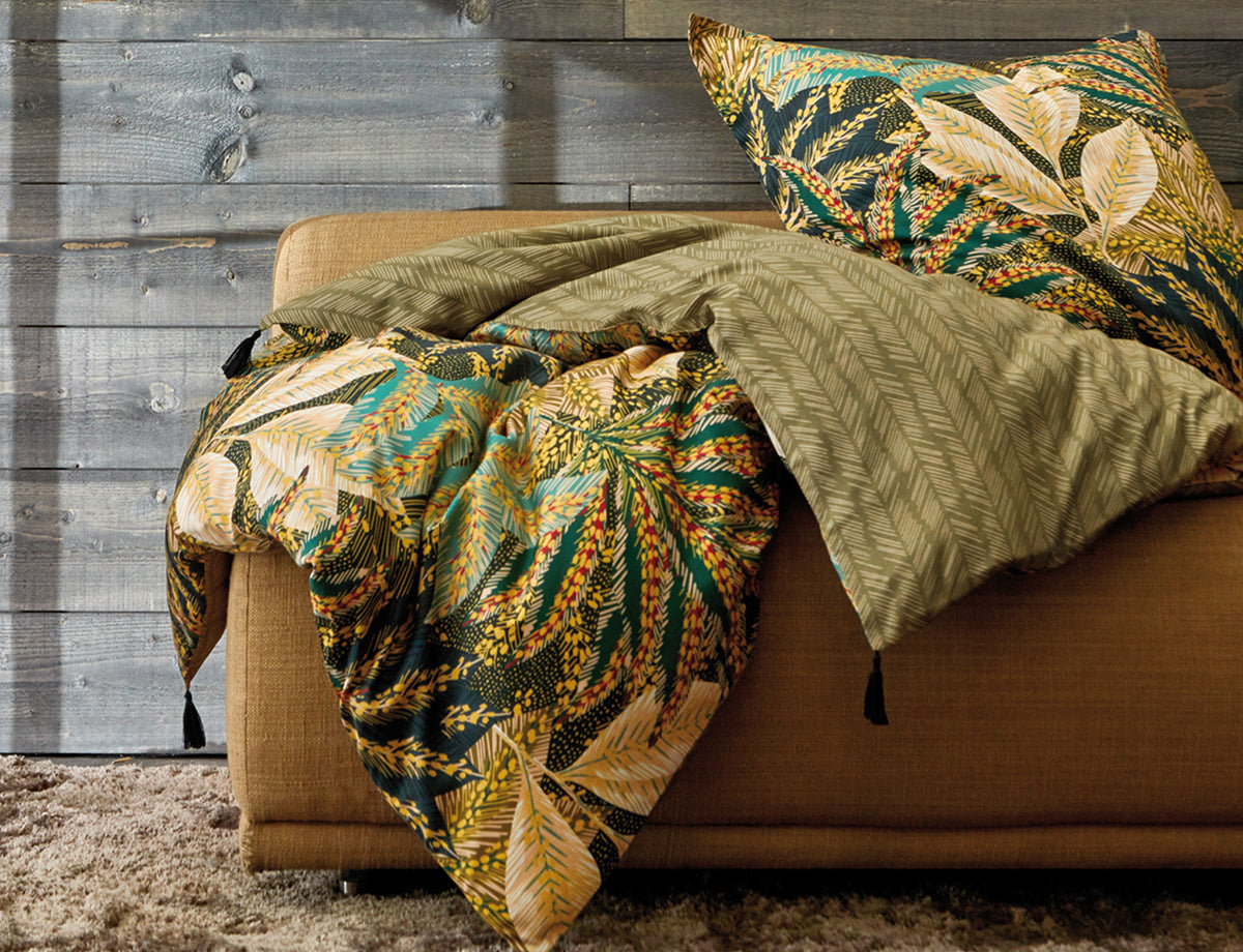 La courtepointe Fantasmagorie jungle est représentée par un motif végétal très luxuriant dans les tons de vert, à la fois chaleureux et vif, l’envers à un motif graphique. Le tout offrant une ambiance exotique à votre intérieur. Réalisée sur un satin de coton 120 fils/cm², pour une douceur incomparable. Dimension 110 x 180 cm.