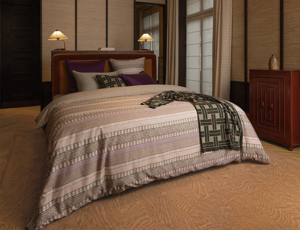 Inspirée d’un patchwork de rayures japonaises puisé dans les archives Kenzo, la taie d'oreiller K Stripe Beige mêle avec audace des motifs graphiques irréguliers dans une palette naturelle de beige, kaki clair, taupe et bordeaux. En filigrane, une subtile peau de bête apporte profondeur et caractère, tandis que le revers au motif discret équilibre l’ensemble avec raffinement.