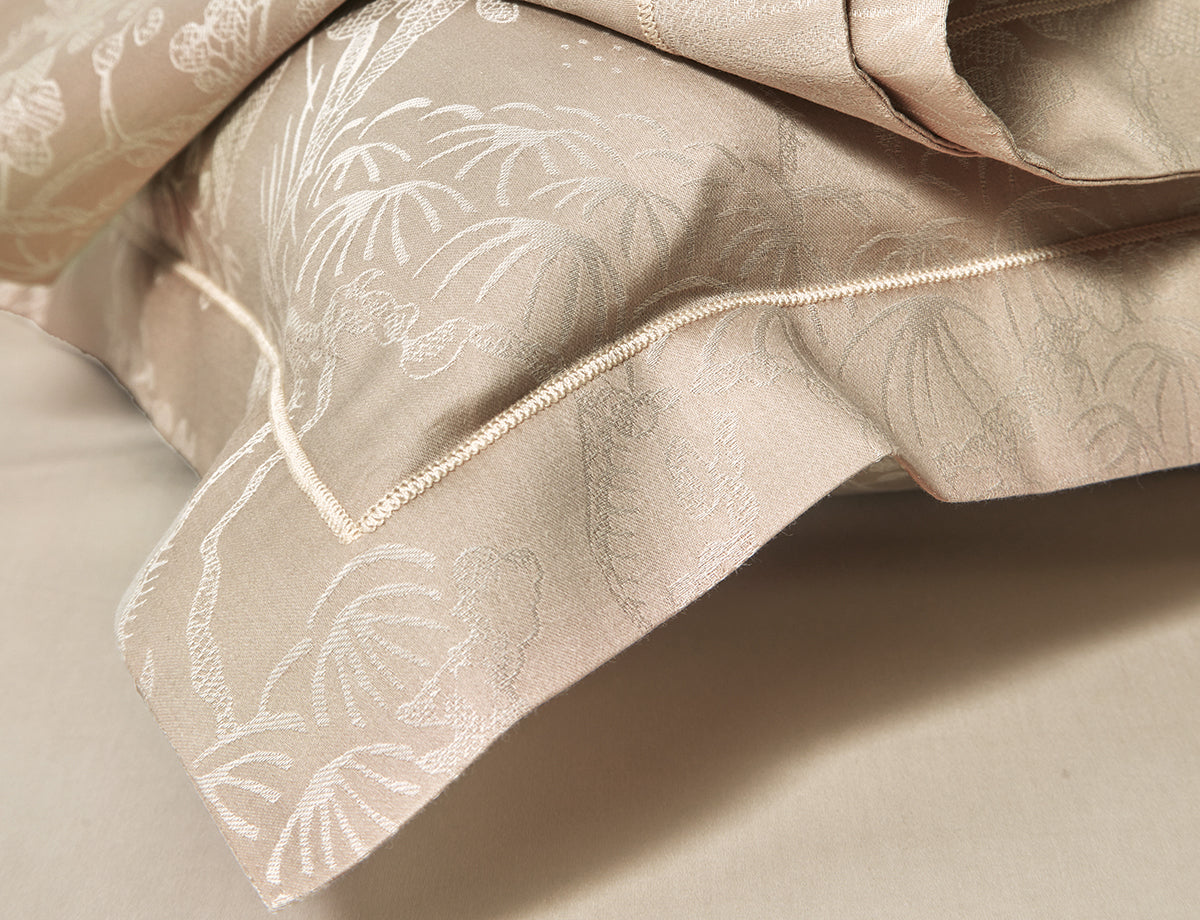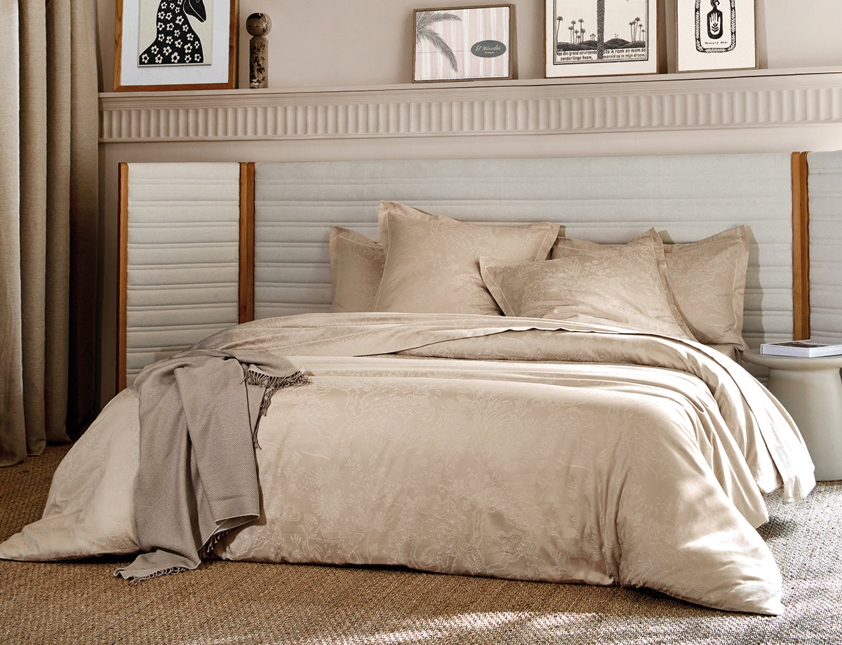 Le satin de coton jacquard offre un toucher soyeux, une grande douceur et une tenue durable, alliant confort et esthétique. Le coloris Chanvre illumine la pièce et apporte une atmosphère apaisante et harmonieuse.