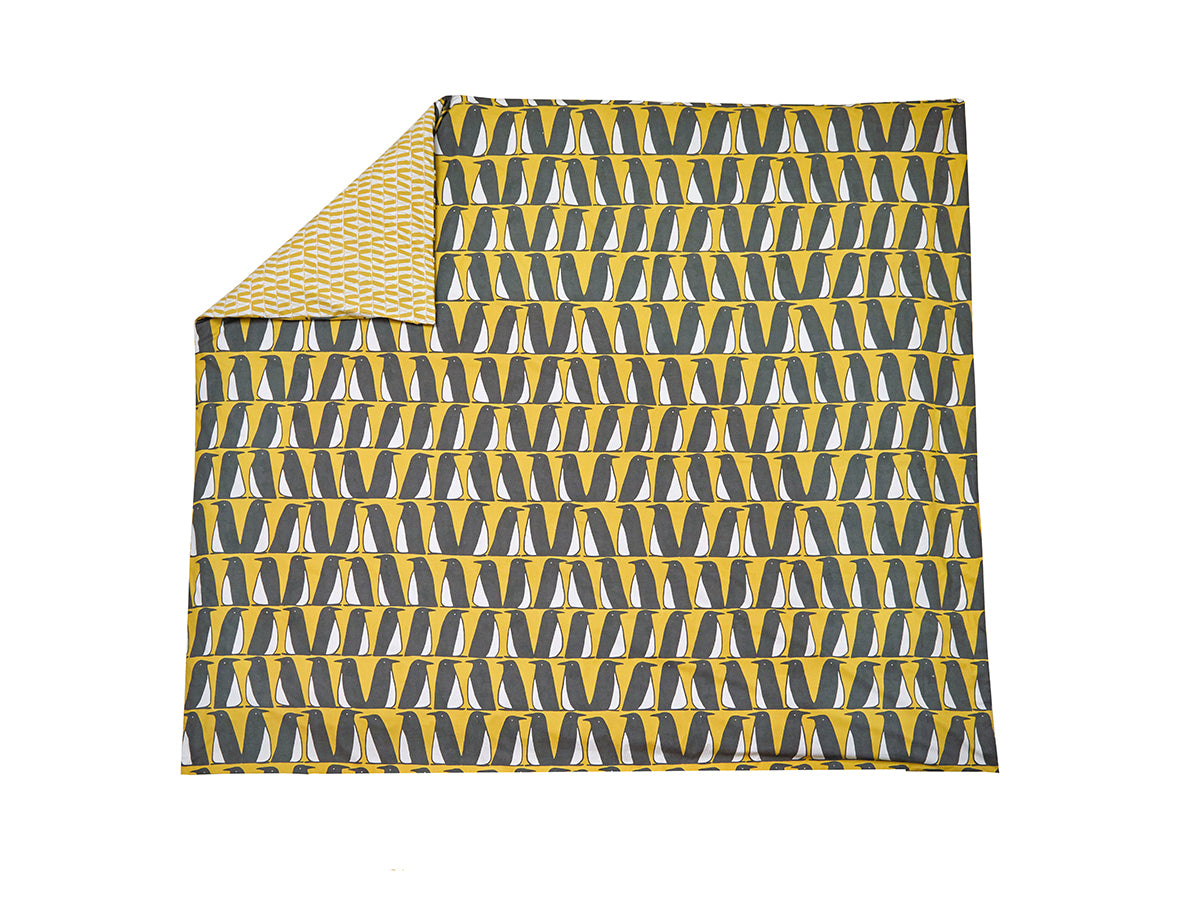 La housse de couette Arctique Gold est imprimée de pingouins noir sur fond jaune, le verso est un motif imprimé de petit pingouins jaune sur fond blanc. La housse et les taies sont entièrement réversibles pour un look personnalisé selon vos envies.