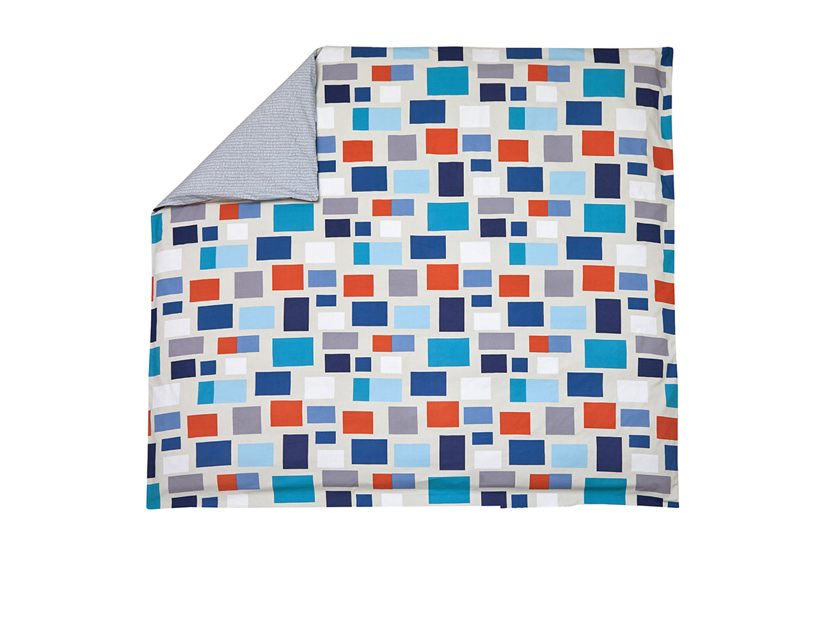 La housse de couette Blocks Céladon à un imprimé de carrés et de rectangles dans les tons bleu, rouge, blanc et gris sur fond beige clair et au verso un imprimé de traits géométrique dans les tons bleu..